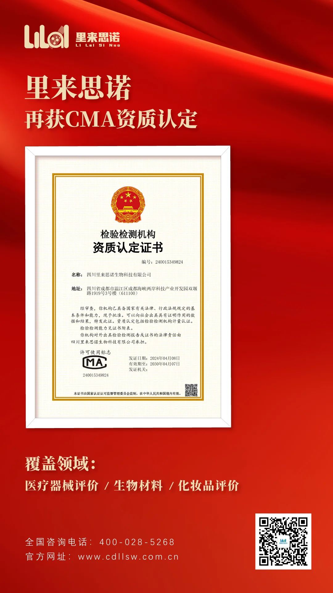 經(jīng)過全員職工四年的持續(xù)努力,在成都醫(yī)學城管委會和成都醫(yī)學城實驗室開放聯(lián)盟的支持下,2024年4月8日,四川里來思諾生物科技有限公司再獲國家檢驗檢測機構資質(zhì)認定(CMA)授權。此次擴項后,公司在醫(yī)療器械和生物材料評價領域可完成符合GB/T、YY/T等國家或行業(yè)標準在內(nèi)的標準化檢驗檢測評價服務,可提供生物材料和醫(yī)療器械的可行性、安全性、有效性性等一體化臨床前研發(fā)服務。