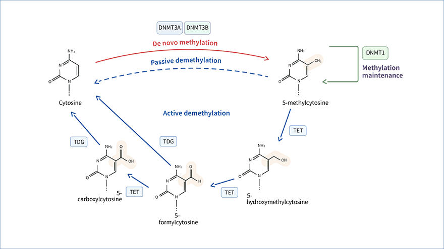 DNA甲基化通常抑制基因表達(dá),去甲基化則誘導(dǎo)了基因的重新活化和表達(dá)。這種DNA修飾方式在不改變基因序列前提下實現(xiàn)對基因表達(dá)的調(diào)控。